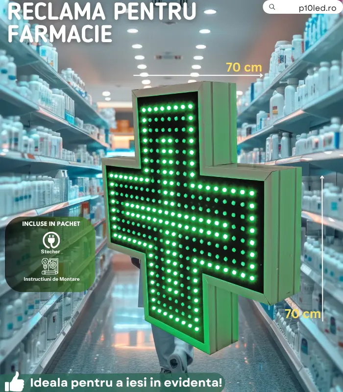 Acest model este ales frecvent de farmacii independente, puncte farmaceutice, clinici mici si unitati medicale care au nevoie de o cruce farmacie LED luminoasa rezistenta si vizibila. LED-urile verzi ofera o luminozitate ridicata si sunt special concepute pentru a evidentia serviciile farmaciei.